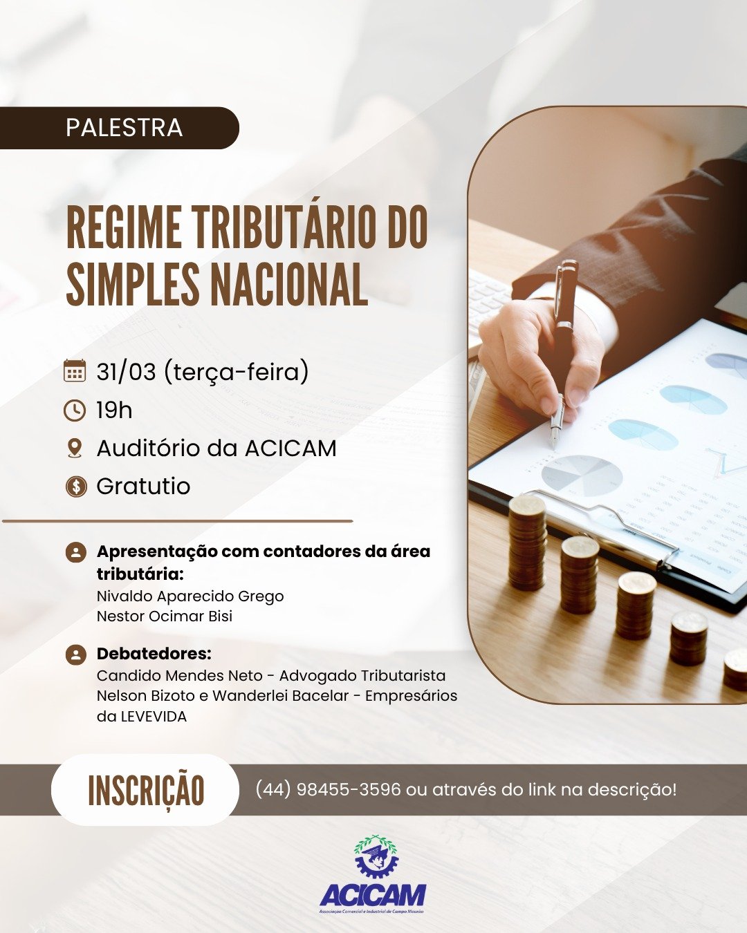 A Associação Comercial e Industrial de Campo Mourão (Acicam) realiza, na noite da próxima terça-feira (31), a palestra gratuita “Regime Tributário do Simples Nacional”. O evento acontece no Auditório Marta Kaiser, na sede da entidade, com início programado para as 19 horas.